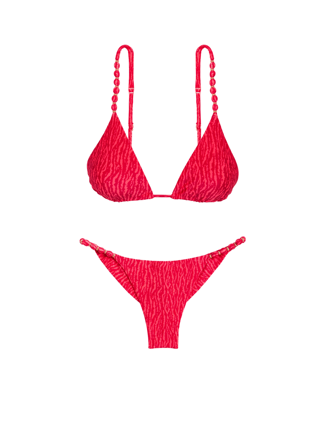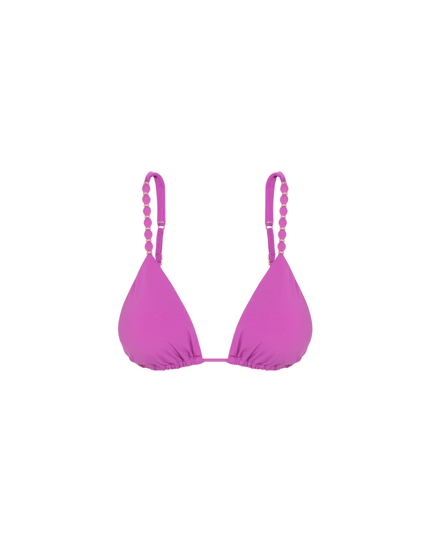 This triangle top is going to set you apart from the rest! With its hand-crafted fabric beading and gold accents you will be the talk of the pool.
