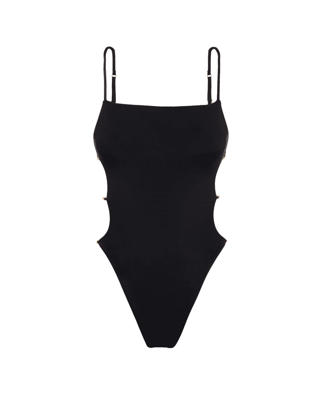 Bandeau style one piece bikini crafted with sultry detailing and golden charms, providing an elegant but cheeky look.