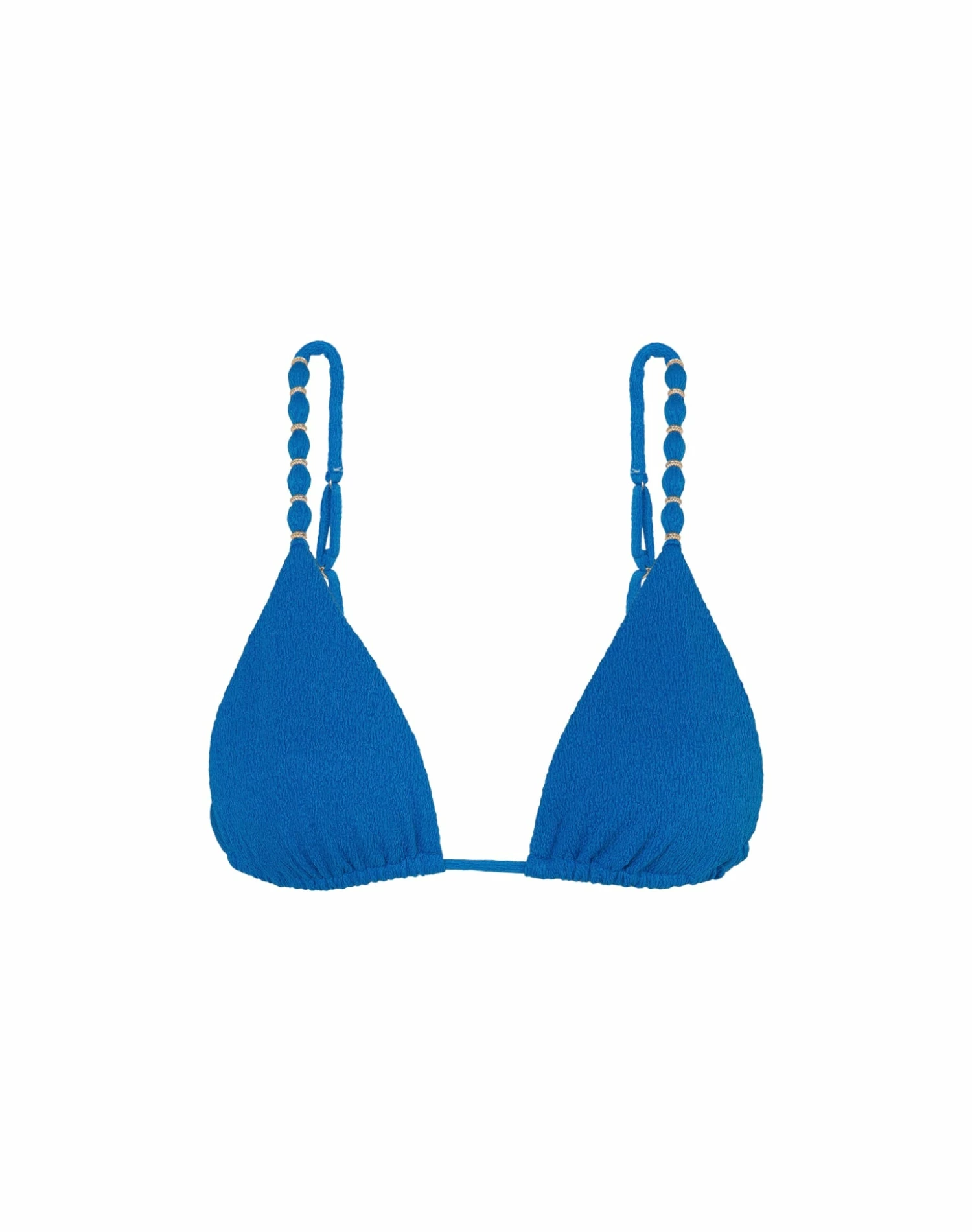 This triangle top is going to set you apart from the rest! With its hand-crafted fabric beading and gold accents you will be the talk of the pool.