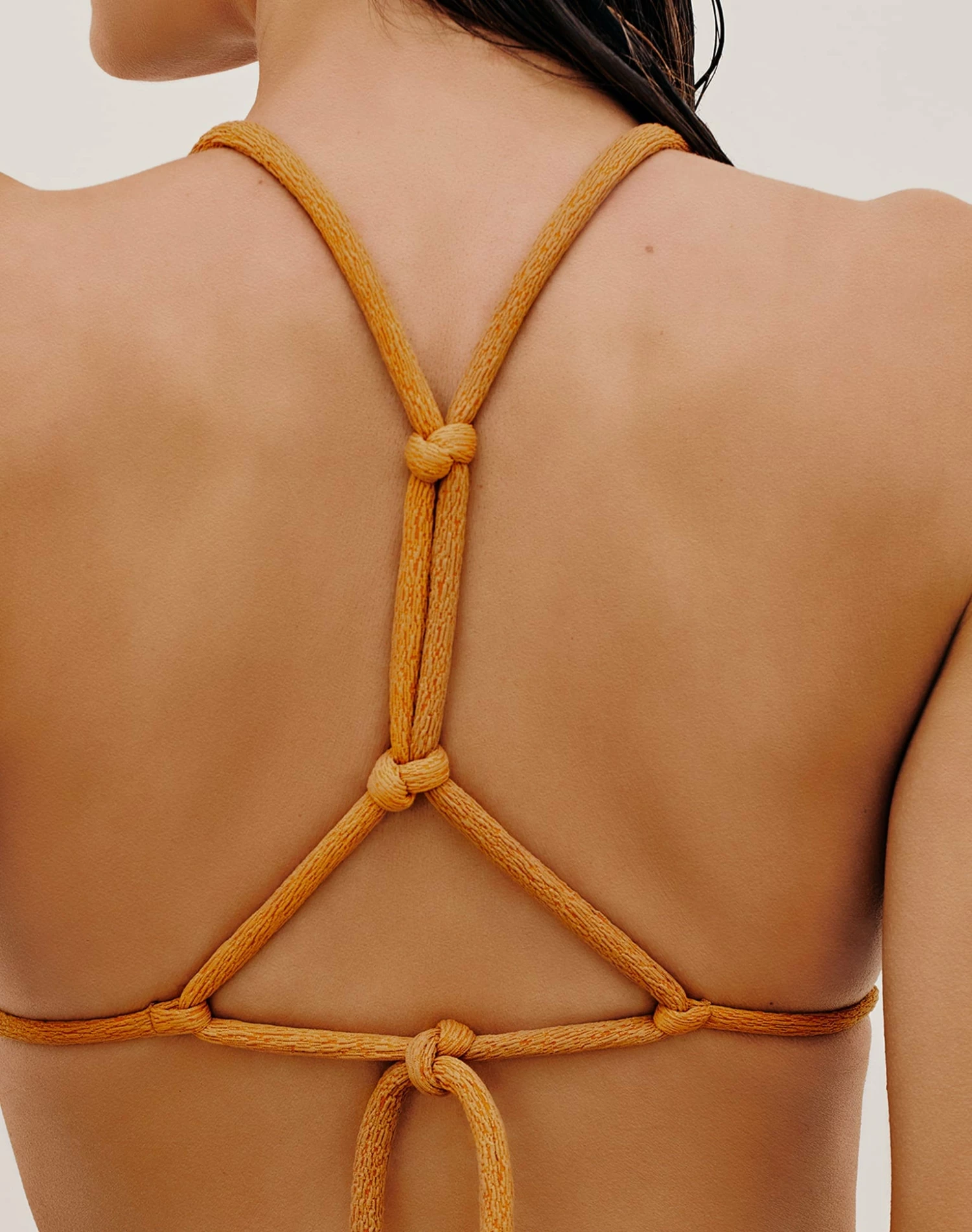 Achieve shoreline glamour in the Edie T Back, a timeless silhouette made for you embrace the heat in the sizzling style. This sunshine stunner is crafted in our exclusive crepe texture fabric, embellished with color contrasrting thick tubular straps that are hand-knitted to elevate your vacation attire.