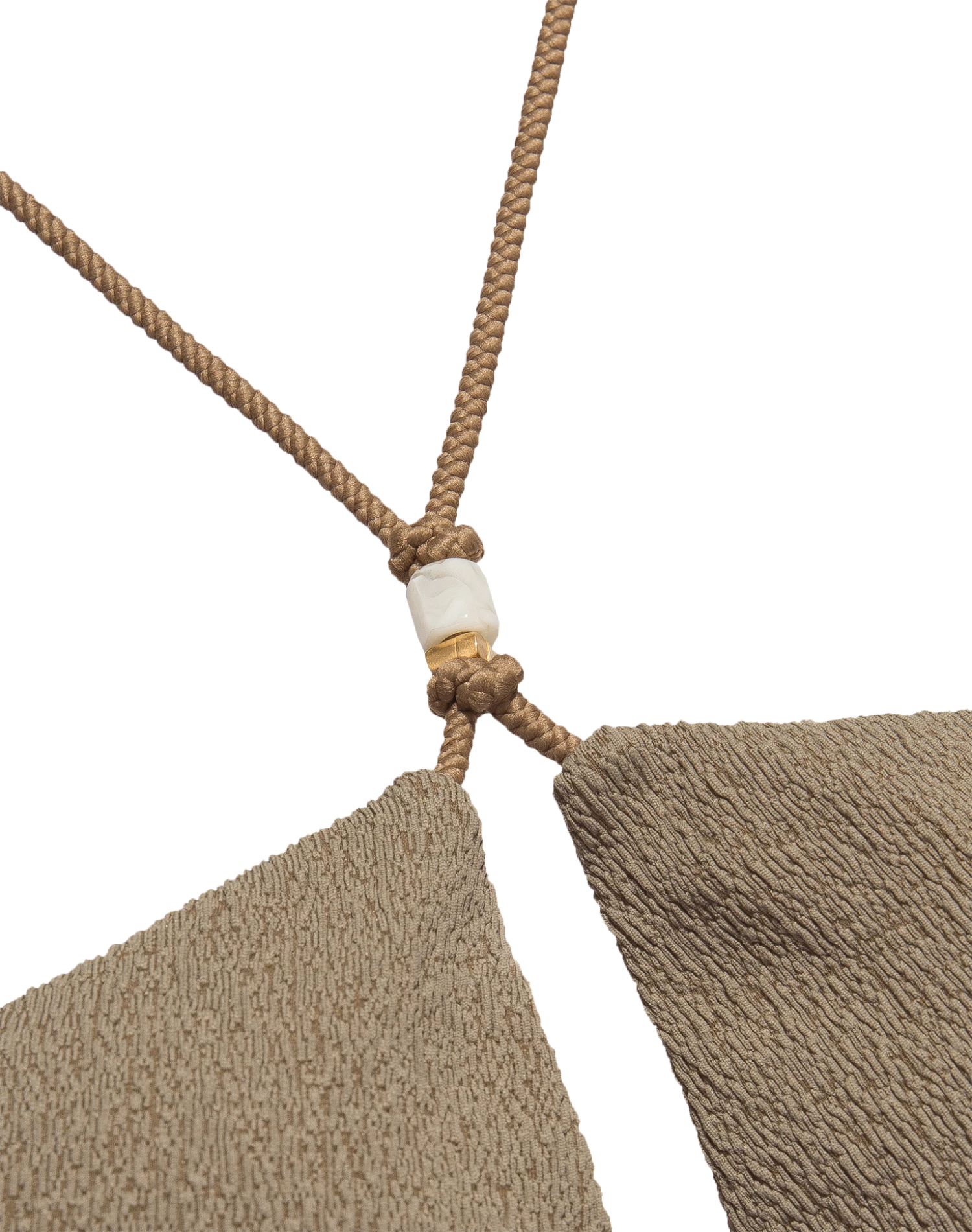 Open front top with a cut-out at the center of the bust, finished off with tortoiseshell resin and metal details, arranged in elastic cord in the same color as the fabric in a V shape on the front, that turns into parallel adjustable straps on the back.
