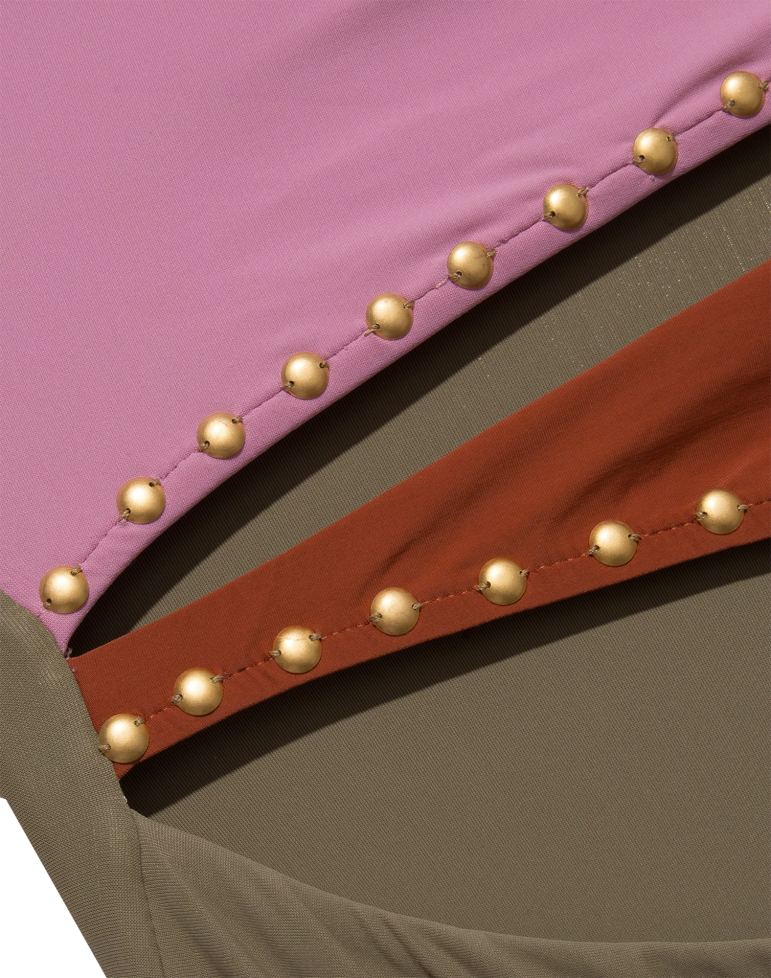 Tri color-blocked one piece in our top colors of the season light pink, deep green, and camel color. Our staple 24k gold studs to accentuate the colors, will have you looking sexy and chic wherever you are out and about.