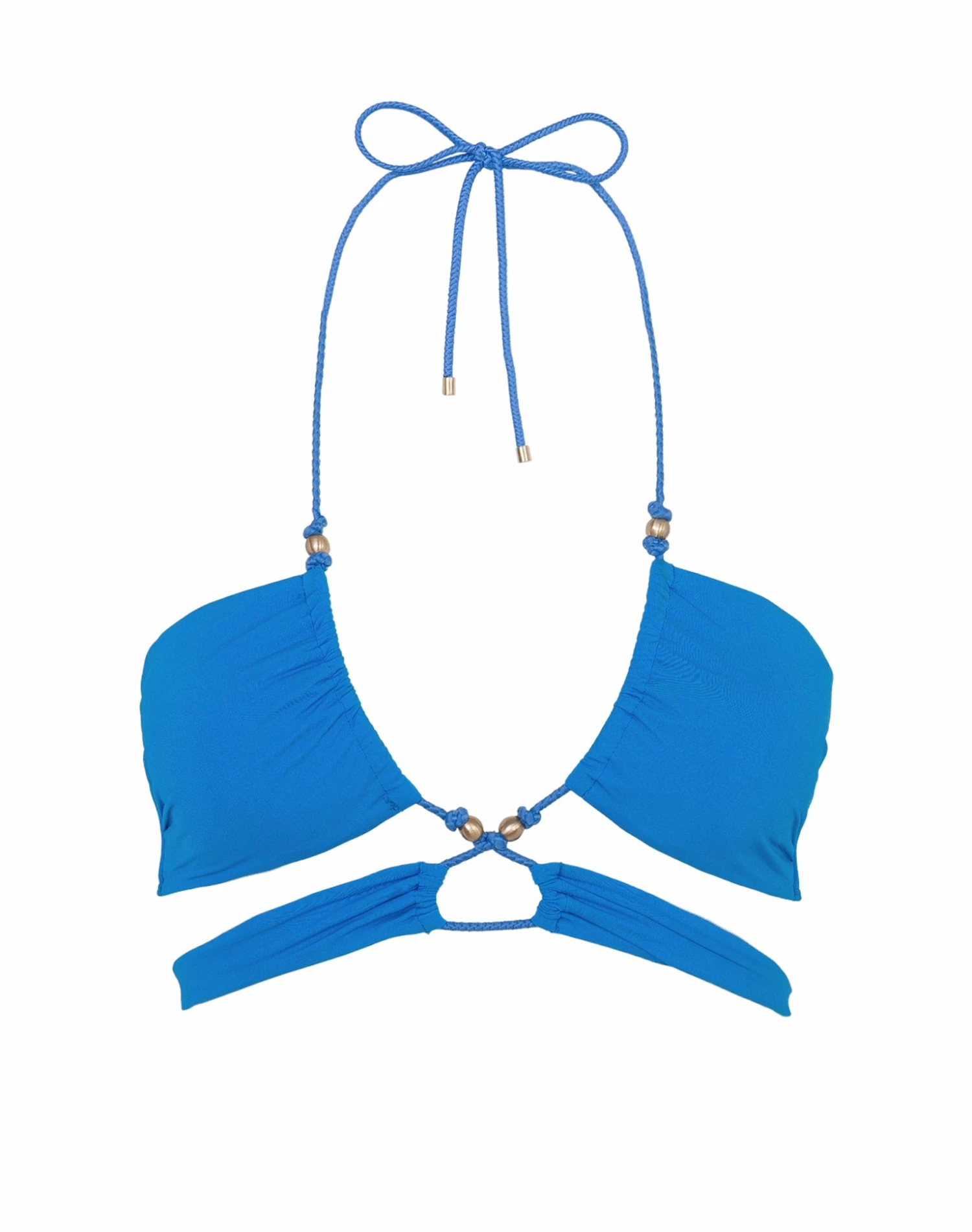 Fashion forward bikini top that embodies femininity with its curve hugging silhouette; adorned with hand-crafted 24k gold dipped charms and waxed rope center detailing. A true head turner.